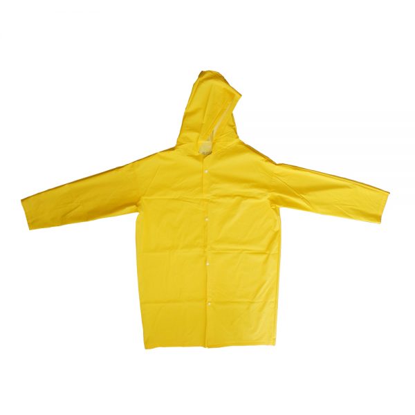 Capa de segurança confeccionada em tecido sintético revestido de PVC em uma das faces (PVC forrado), fechamento frontal por meio de quatro botões plásticos de pressão, com manga longa.